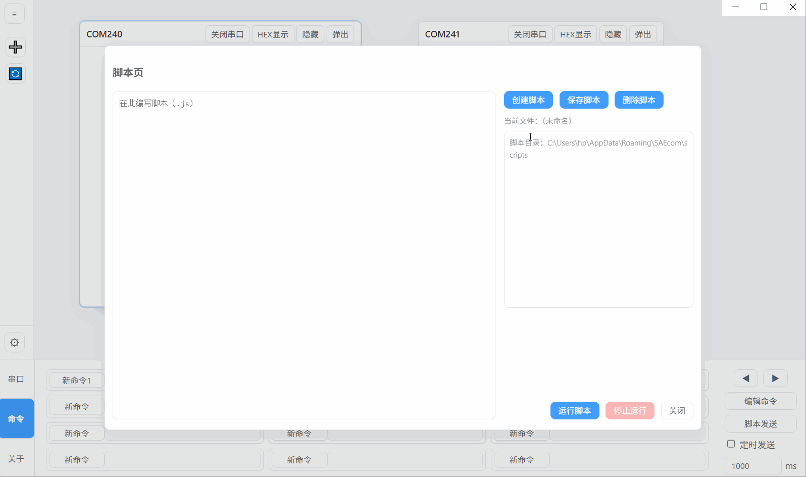 内置脚本运行环境,可以快速编写脚本实现自动化操作。 例如:定时生成随机字符串并通过串口发送。 脚本可一键运行 / 停止,方便测试和扩展。