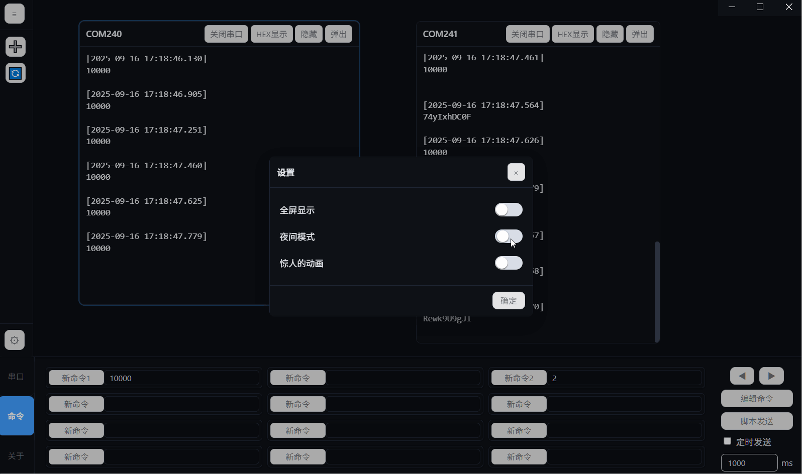 支持保存常用命令,并在命令面板中快速调用。 自动发送功能带有动态效果,能清晰区分正在执行的指令。